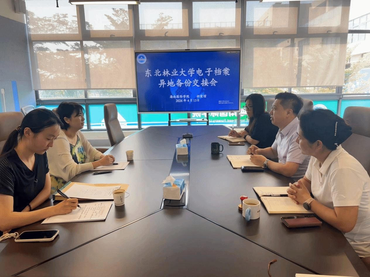 4月13日,东北林业大学电子档案异地备份交接会在海南国际学院举行。海南国际学院院长刘志明、副院长马锐、学校档案馆馆长王艳华及相关工作人员出席会议。